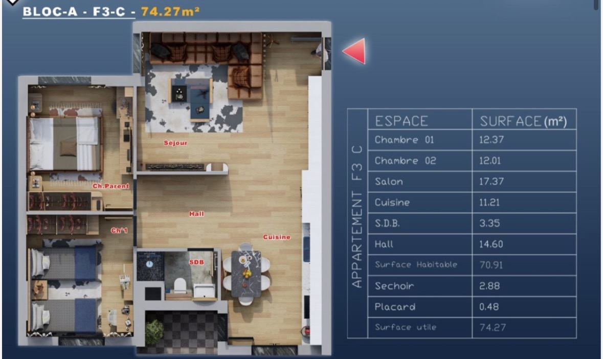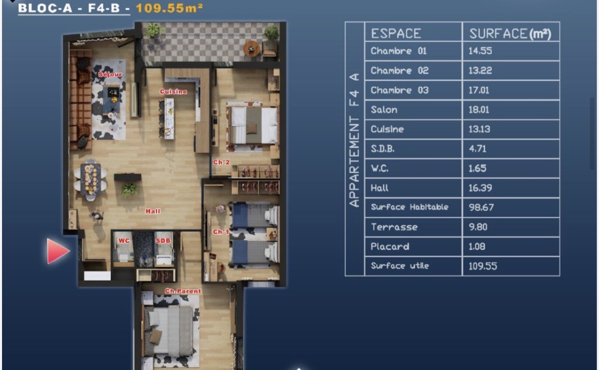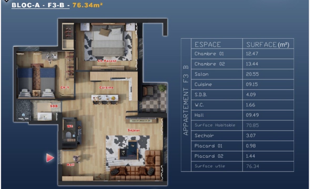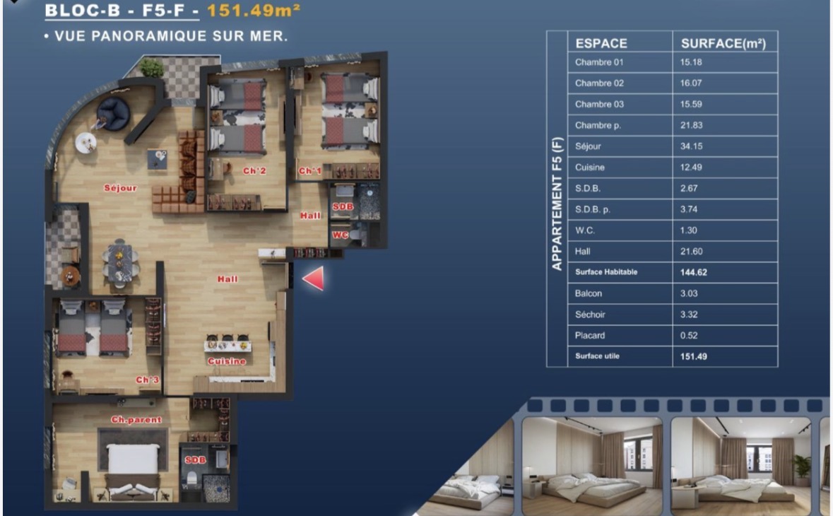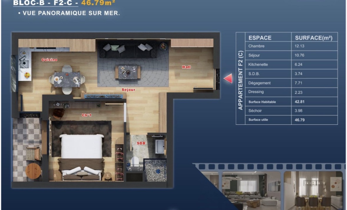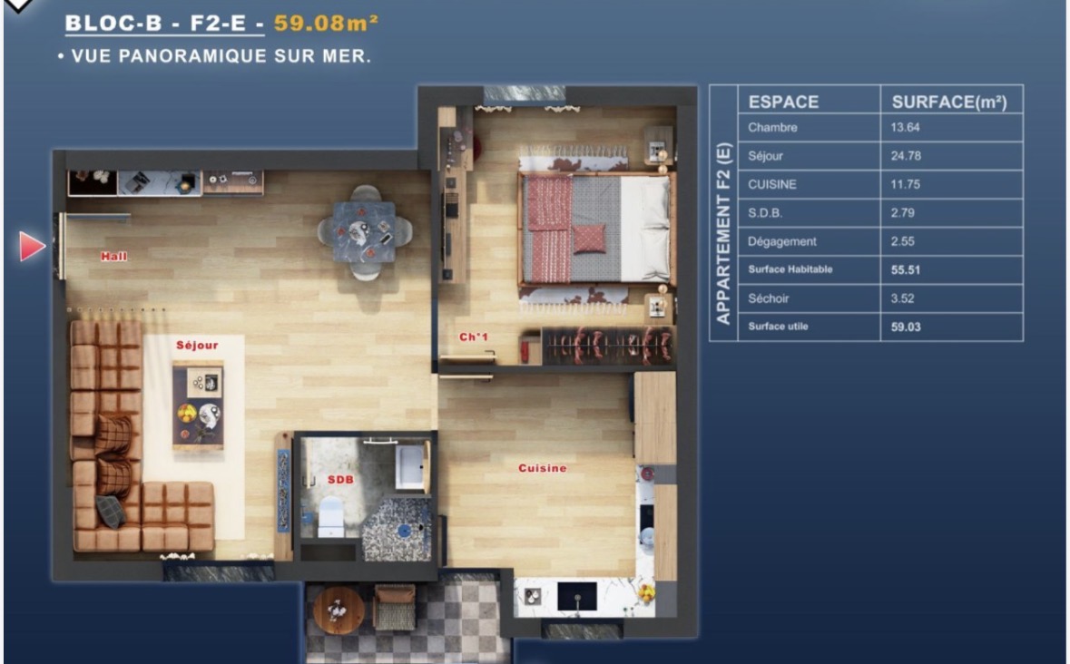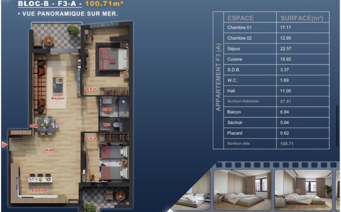 La Résidence Palais Nova se compose de deux blocs ouverts sur la mer, offrant des appartements avec terrasses et un parking en sous-sol. Elle garantit une sécurité optimale grâce au gardiennage 24/7, à la vidéosurveillance, aux portes blindées et à un hall protégé par digicode et vidéophone. Chaque logement bénéficie d’un haut niveau de confort avec cuisine moderne, suite parentale, salles de bain équipées, chauffage central et menuiserie aluminium à double vitrage. La résidence dispose également d’installations essentielles comme une bâche à eau, une chaudière individuelle, un réseau anti-incendie, ainsi qu’une centrale parabole. Les appartements sont précâblés pour l’internet haut débit et profitent de vues panoramiques sur la mer. Le hall décoré par un designer, les deux ascenseurs avec accès direct au parking et la gestion assurée par le promoteur complètent ce cadre de vie moderne et premium.